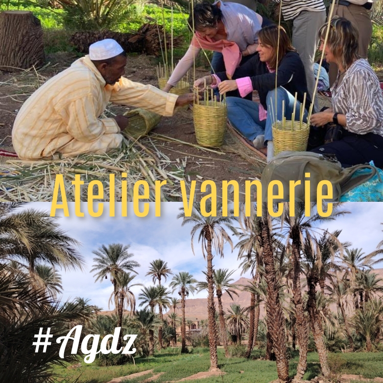 👉 1 journée atelier vannerie au cœur de la palmeraie Tamnougalt, réalisez votre panier en feuille de palme.